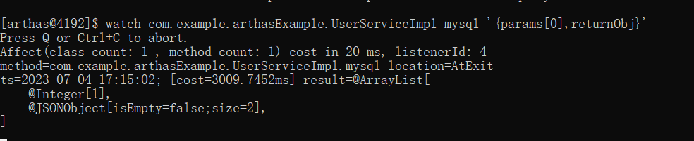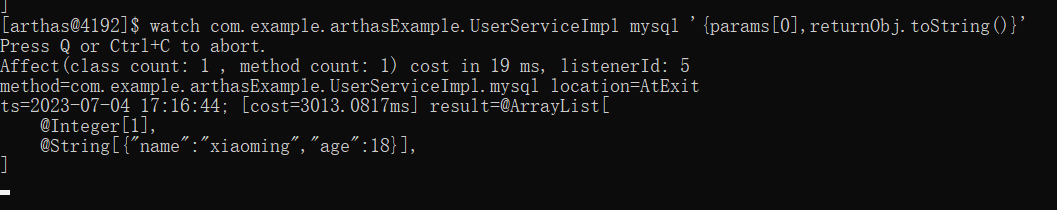 watch com.example.arthasExample.UserServiceImpl mysql '{params[0],returnObj.toString()}'