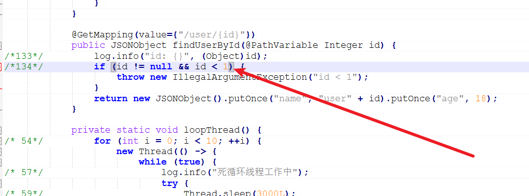 有时候我们测试难免会遗漏一些情况,如下所示,我们业务要求id小于1才抛出异常,但是我们因为粗心而将判断条件写成id<2,结果懵懵懂懂的就将这段代码部到了生产环境,导致业务查询出了问题。