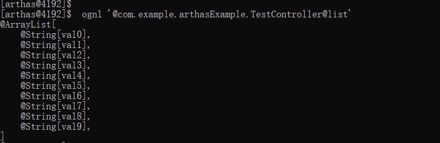 于是对应的指令我们可以改为ognl -c 68de145 '@com.example.arthasExample.TestController@list',而输出结果如下,可以看到变量的类型和数值都可以看到:
