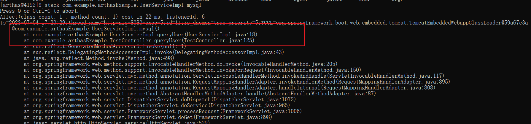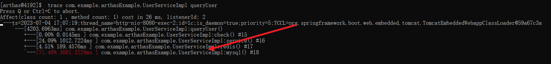 trace com.example.arthasExample.UserServiceImpl queryUser