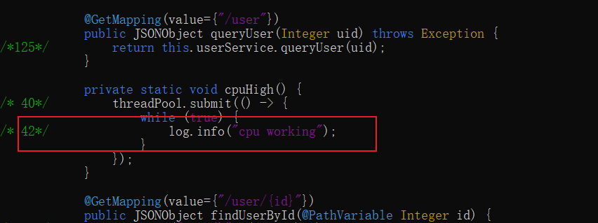 有了Arthas之后,问题的定位就会简单快速许多,为了演示这个例子,笔者编写了一段模拟CPU 100%问题的代码段: