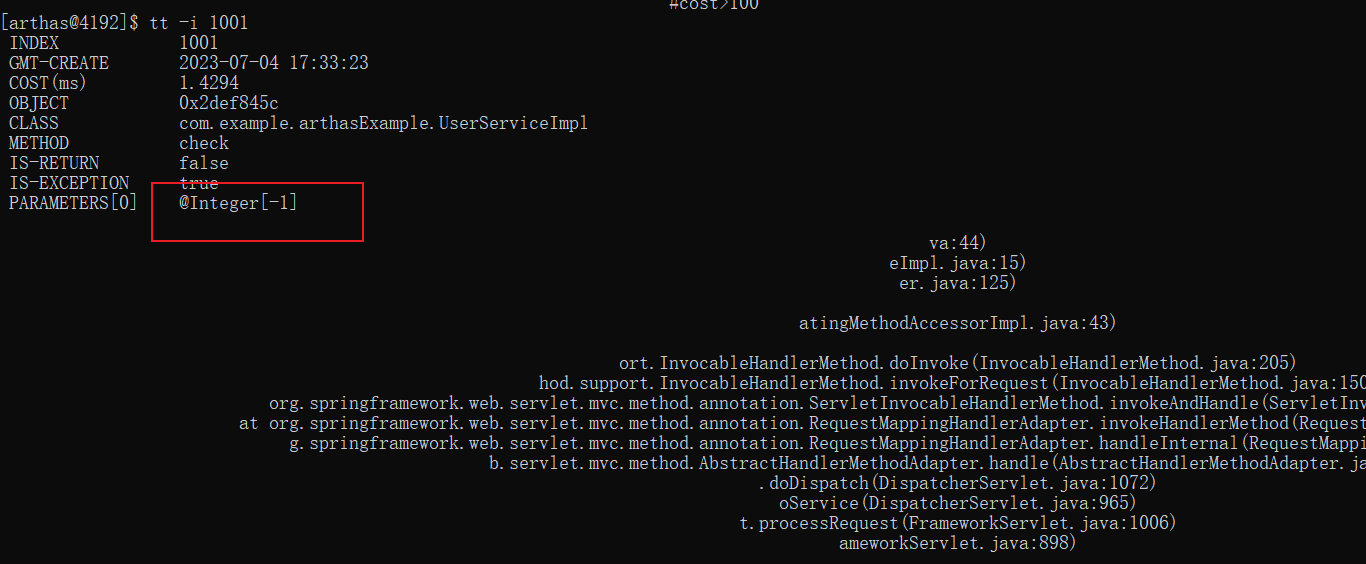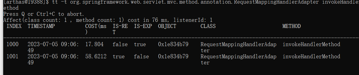 首先我们使用tt指令对RequestMappingHandlerAdapter 进行追逐,如下所示,笔者通过-t知名要追踪的类的全路径和方法,后续只要有请求调用该方法,tt指令就会显示追踪的信息: