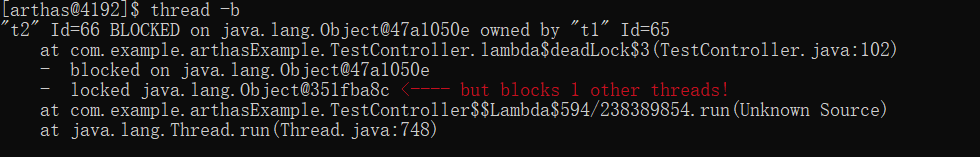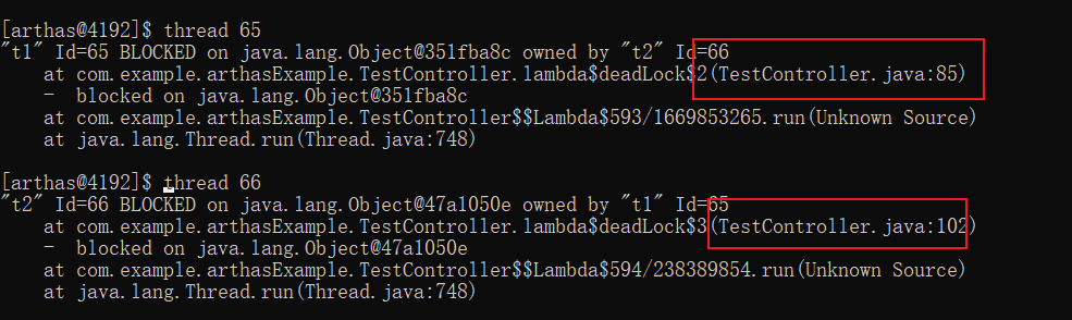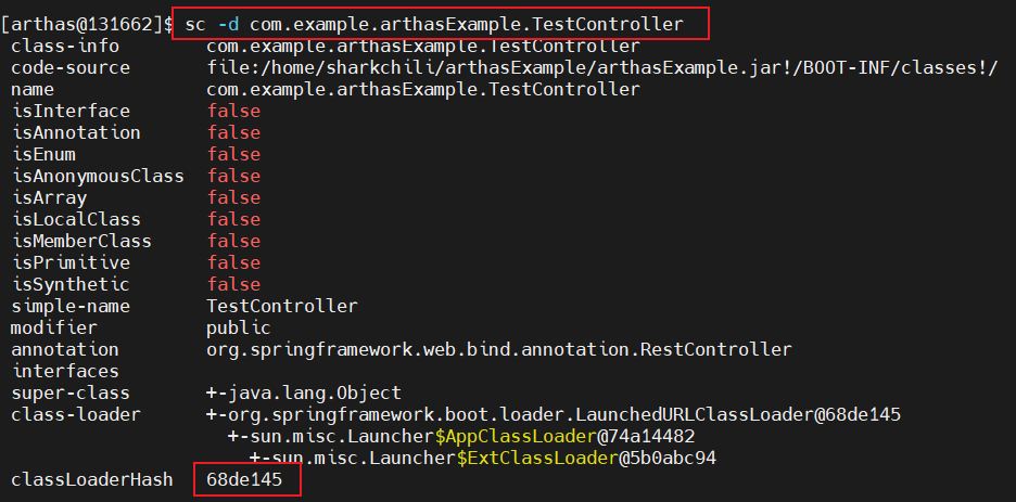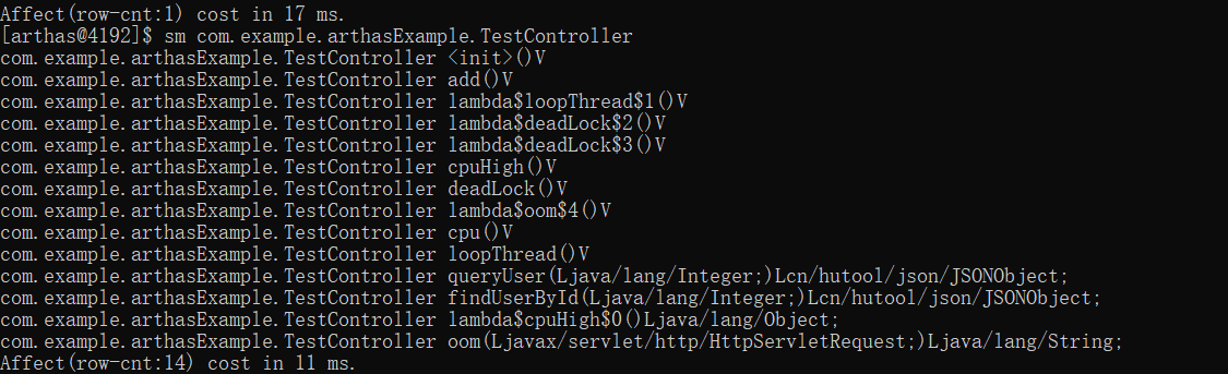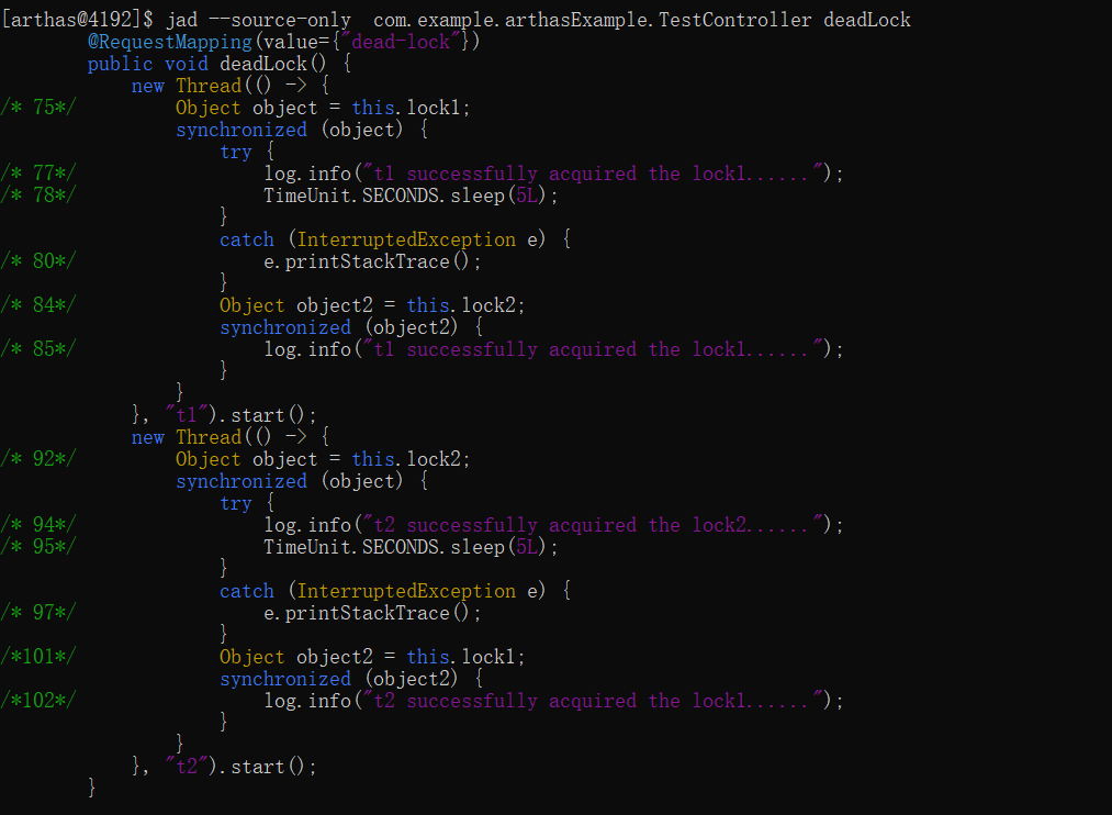 知道了代码的位置之后,我们根据类的包路径com.example.arthasExample.TestController直接通过Arthas反编译查看源码,命令如下:
