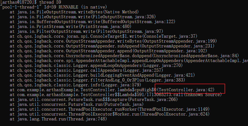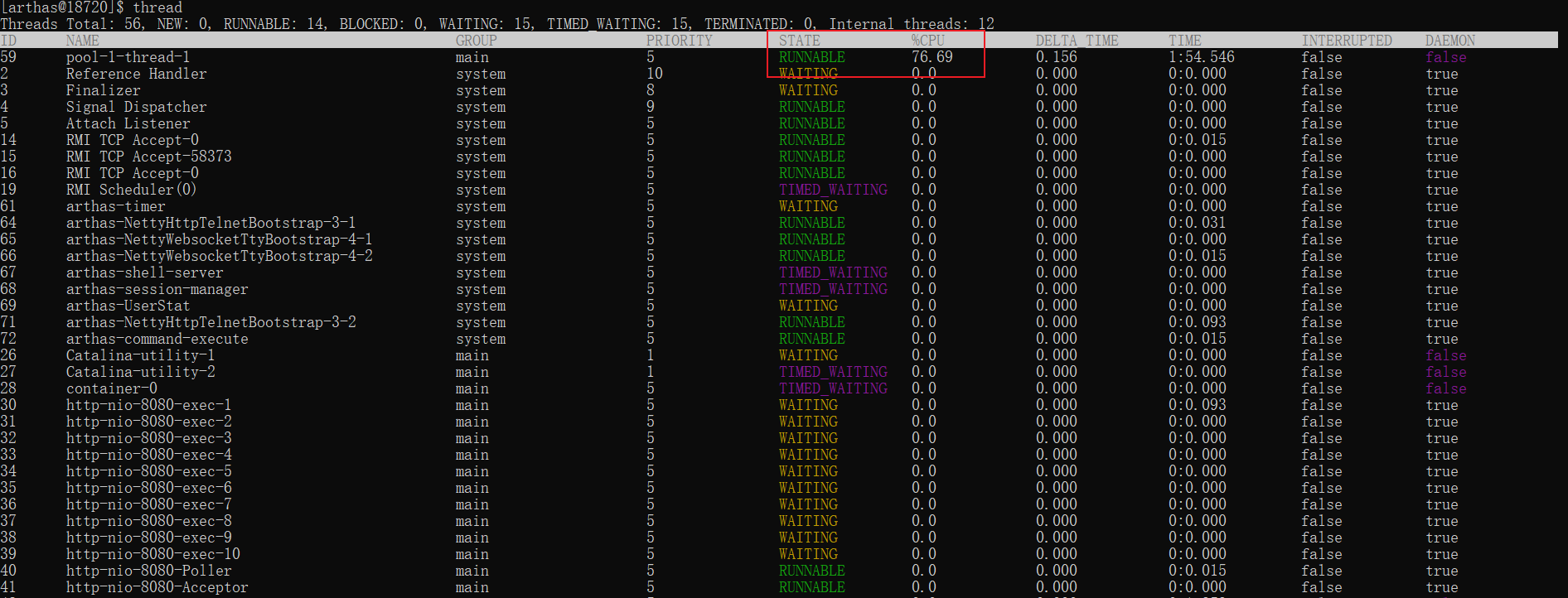 进入控制台,我们直接键入thread命令可以看到,有一个名为 pool-1-thread-1的线程CPU使用率非常高,所以我们需要定位它所工作的代码段。