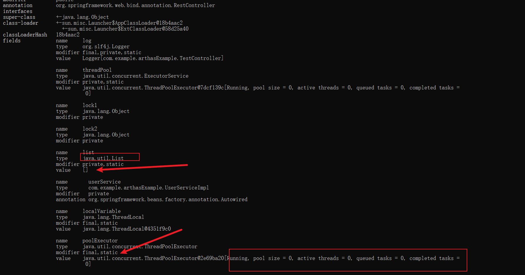 可以看到这条指令不仅可以查看字段的定义和注解,还可以查看线程池的使用情况以及集合内部的value:
