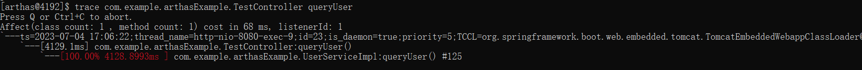 我们可以用trace命令,我们首先用trace追踪一下TestController 的queryUser耗时的调用: