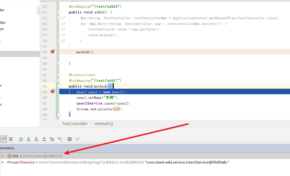 这个问题,我们不妨举个例子来说吧,首先我们看看下面这段代码,很明显如果我们直接调用add17报错了事务会回滚,原因很简单,这个method1加了注解,所以如果我们通过api等工具调用method1时,真正执行这段代码的对象是结果Spring容器bpp处理过的cglib代理类: