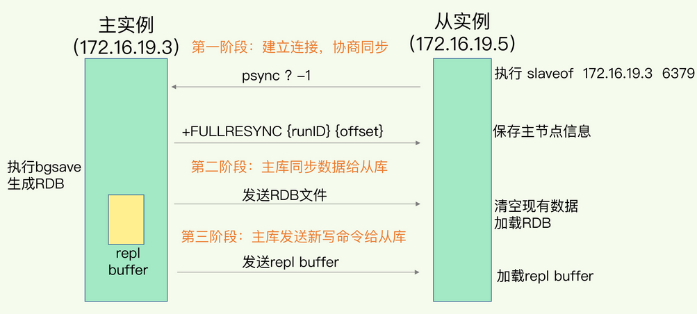 主从复制有两种模式,我就先来说说全量复制吧,如下图,整体步骤为: