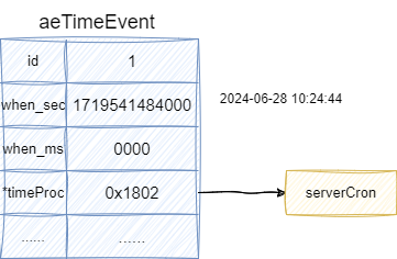 我们以一个redis定时执行的任务为例,如下所示,该结果通过when_sec和when_ms记录秒之前的时间和毫秒的时间,一旦这个时间到了就会执行timeProc这个函数指针所指向的方法serverCron,该函数会定期执行各种任务,这一点笔者会在后文展开: