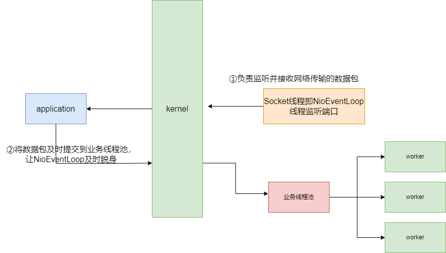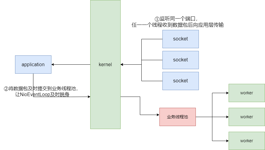 常规的Netty处理UDP包我们只能用按个NIOEventLoop线程接收传输的数据包,从底层来看即只使用一个socket线程监听网络端口,通过这一个线程将数据传输到应用层上,这一切使得我们唯一能够调优的方式就是在Socket监听传输时尽可能快速将发送给应用程序,让应用程序及时处理完以便NIOEventLoop线程能够及时处理下一个UDP数据包。亦或者,我们也可以直接通过增加服务器的数量通过集群的方式提升系统整体的吞吐量。
