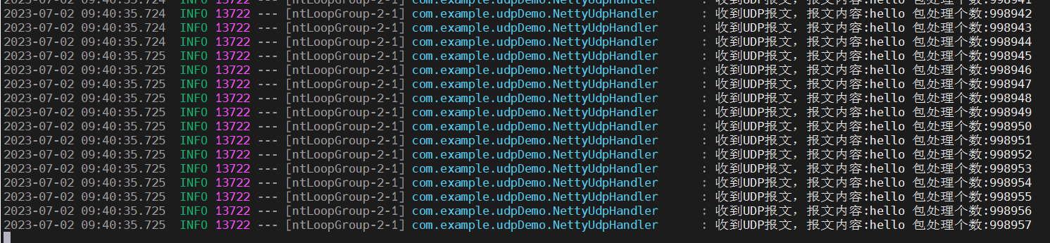处理类的逻辑比较简单了,收到内容后打印后,原子类自增一下,该原子类是用于后续压测统计是否丢包用的。