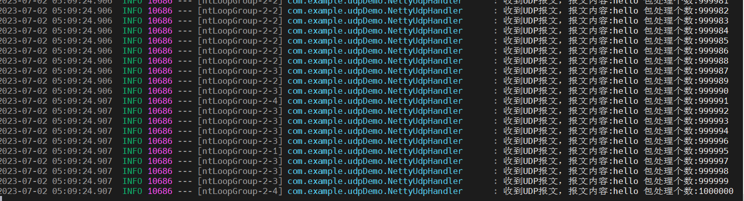 LOG.info("收到UDP报文,报文内容:{} 包处理个数:{}", new String(array),atomicInteger.incrementAndGet());