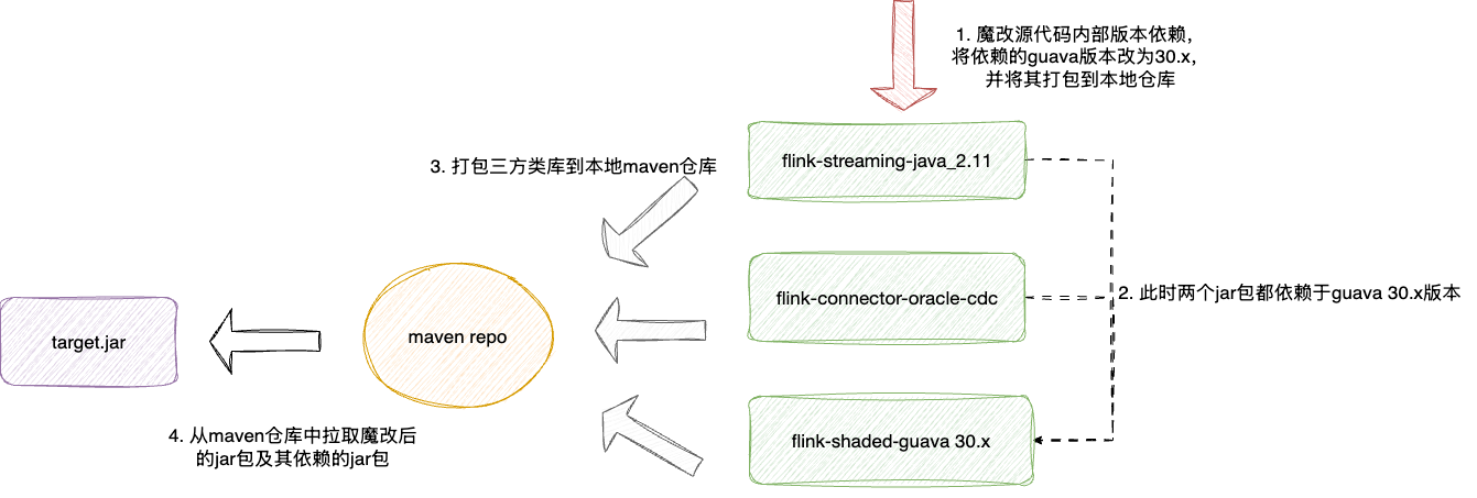 基于此类问题,我们的解决思路很简单,即让两个都需要Guava的jar包都依赖于同一个版本的Guava。而要解决这个问题,就必须修改jar包的源代码。