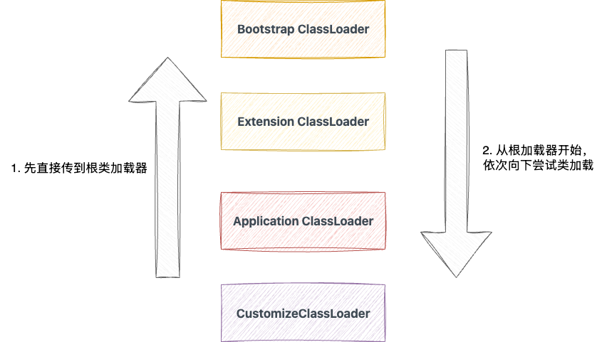 上述方案可能相对麻烦一些,对于java类加载机制比较熟悉的读者可能都知道,Java类加载有着严格的双亲委派机制,即发起一个类加载请求时,该请求会不断向上委托,直到最顶层的类加载器,然后从最顶层的Bootstrap类加载器开始尝试加载,若加载失败则依次向下传递尝试。