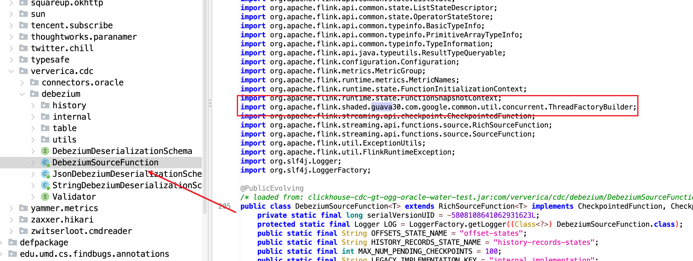 DebeziumSourceFunction.java,包路径与flink-streaming-java_2.11中该类保持一致:org.apache.flink.streaming.connectors.jdbc; - 修改该文件中的Guava依赖import语句,改为引用Guava 30.x版本