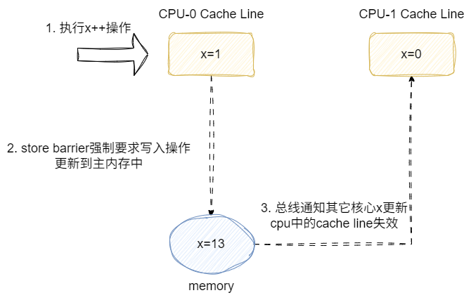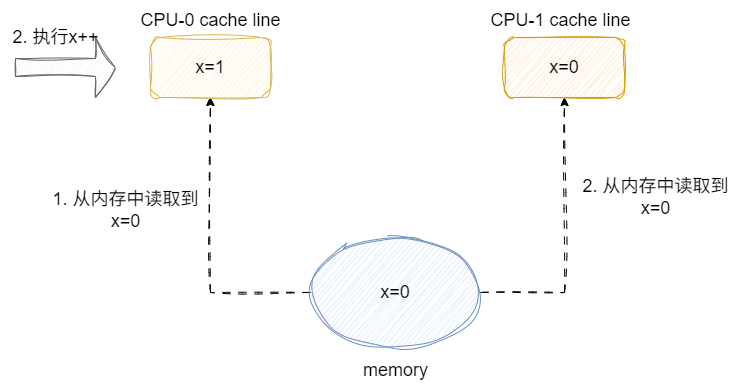 如下图,两个CPU同时从内存中加载到x为0,然后cpu-0执行程序中的累加指令,在cpu-0未将指令下回内存时,就短暂的出现数据不一致的情况: