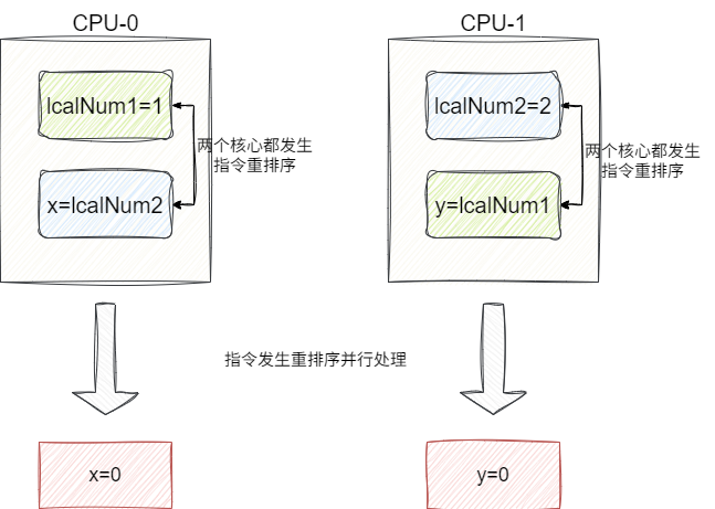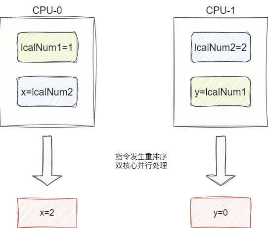 极端情况,假设两个CPU都发生编译器重排序就可能出现CPU-0先执行x=lcalNum2,CPU-1执行y=lcalNum1,因为这两个本地变量初始化赋值指令被重排序,导致x、y最终被设置为0: