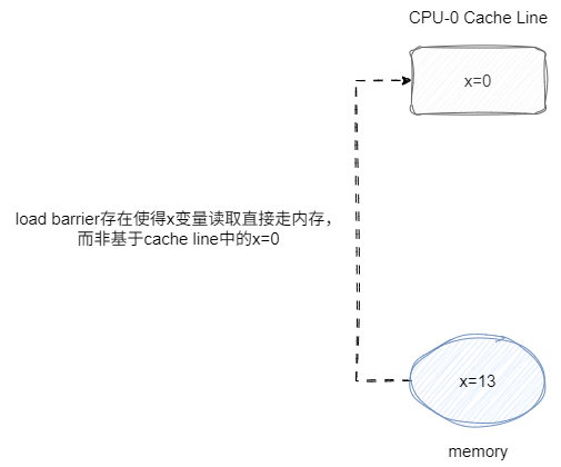 对于Load Barrier而言,若在指令前插入Load Barrier,该屏障可读取数据时强制要求处理器将本地cache line设置为无效,直接从内存中读取数据: