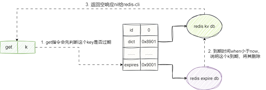 后续我们在通过get指令获取参数时,首先会看到expires字典中查看这个key是否过期,如果过期则将dict字典中的键值对删除,返回给客户端nil,反之返回键值对的结果: