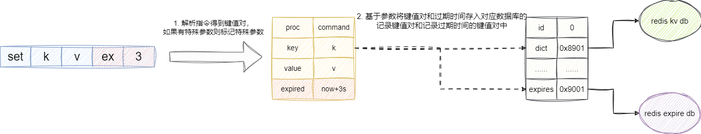 解析到键值对kv之后,定位到当前客户端指针所指向的数据库db(默认为0),先将其存储到数据库结构体记录键值对的字典dict中,然后基于ex后面的参数得到期时间并以k作为键,到期时间作为value将其其存到expires字典中: