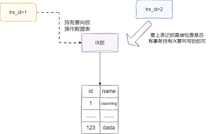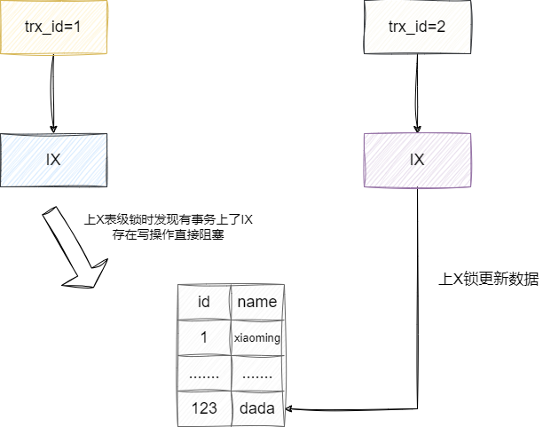 同理假设我们的尝试IX锁进行修改操作,需要针对全表上X锁,此时我们就需要检查是否有其他事务上了IS或者IX以确定是否存在数据操作,如果有则阻塞等待,这就是IS、IX锁对于数据读写操作的巧妙设计: