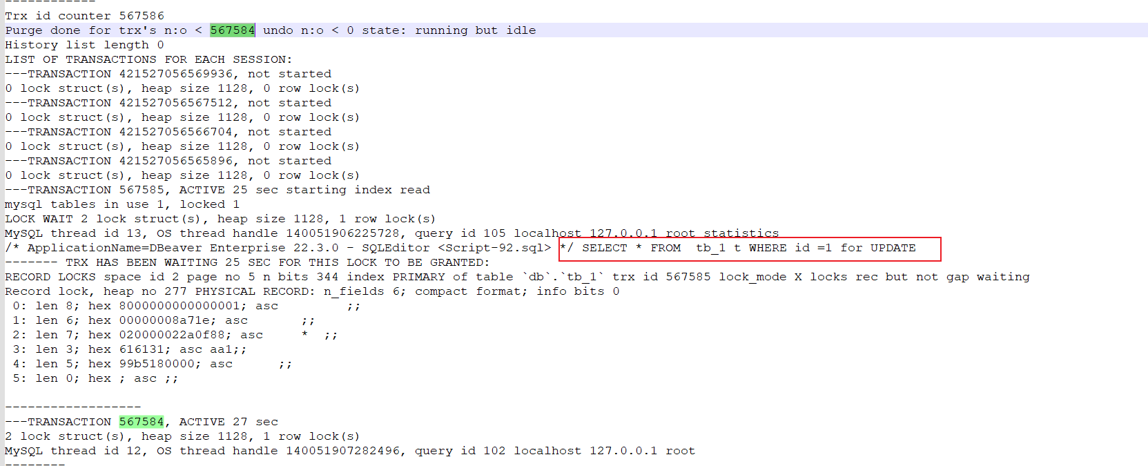 最终,可以看到处于等待的事务567585锁等待的事务567584所执行的SQL语句,很明显是因为上了同一个行级锁造成事务567585等待造成死锁: