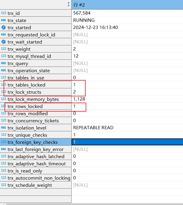 如下图,可以看到我们567584这个事务,这里我们着重查看trx_tables_locked、trx_lock_structs、trx_rows_locked三个字段,其含义分别是: