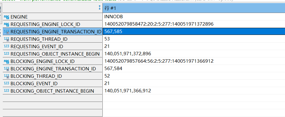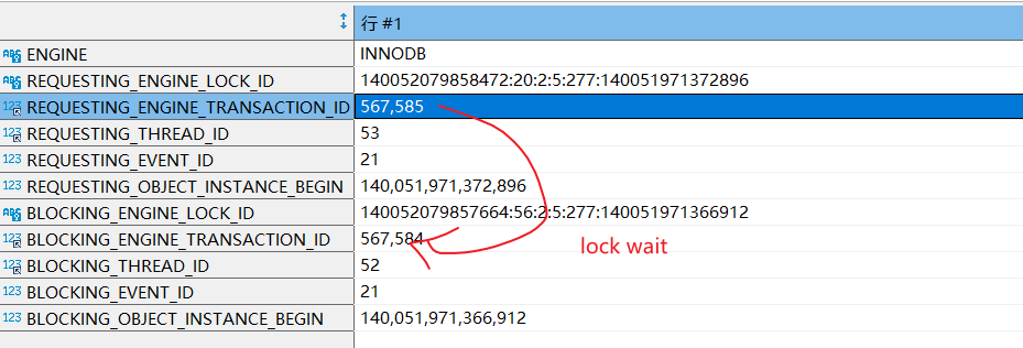 最后再到data_lock_waits可以看到567585的事务等待567584的事务