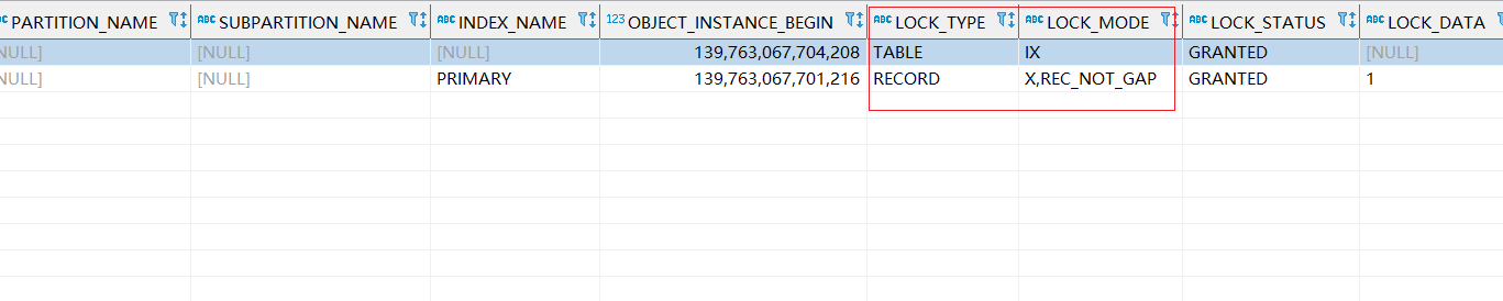 通过performance_schema.data_locks表,可以看到这条该事务上X锁前上了一把IX锁之后,针对这条记录上了X,REC_NOT_GAP即上了一把行级锁,但是不锁住间隙: