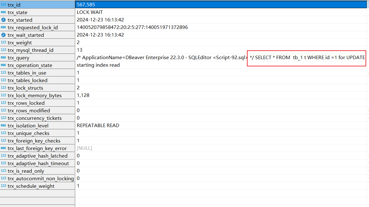 此时,在窗口键入一下SQL进行查询,可以看到笔者用了for update对id为1的数据上了排他锁。