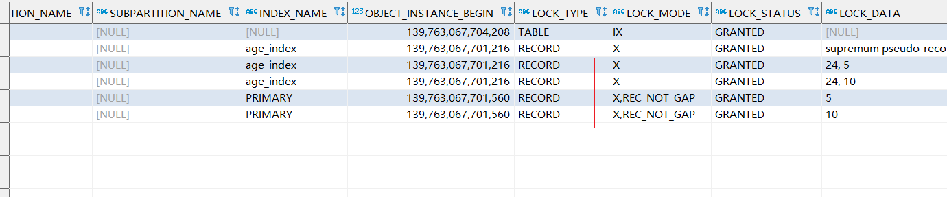 因为年龄上了索引,所以查询时走了范围索引,从performance_schema.data_locks可以看出该操作针对id为5、10这两条年龄为24的数据都上了行级锁和间隙锁,导致数据插入失败: