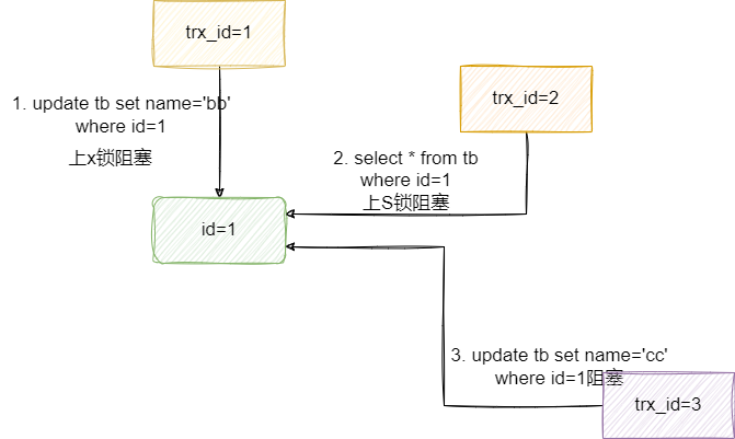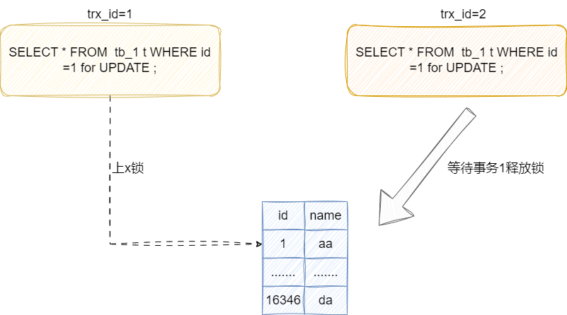 如下图这个说明,假设的我们的事务1先针对id为1的值上了一把写锁,对应事务的SQL如下:
