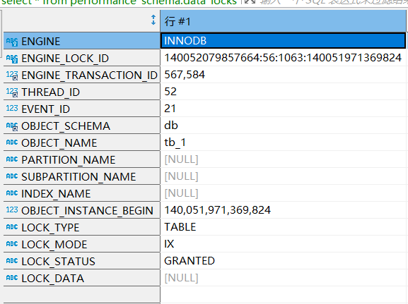 如下图,可以看到567834事务的线程号、事件id以及这个事务在tb_1表上了一把IX意向读锁: