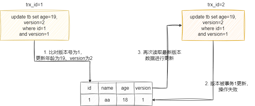 而乐观锁则是一种业务锁,通过用户手动对表增加一个版本号的字段来解决并发数据正确性问题,如下图所示,某个时间点两个相同的事务读取到相同版本号的当行数据,彼此都执行更新逻辑,为了保证并发更新保证数据准确性,我们就需要通过版本号确保自己更新的数据是最新数据,如下图所示,左边的更新SQL最先执行,这就使得右边的更新失败了,这样右边的事务就知道自己更新条件数据已过期,就会修改版本号再次进行更新。