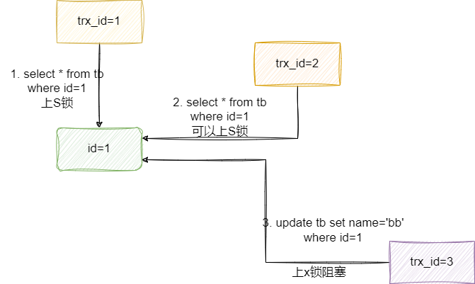 共享锁(Share Lock,S 锁):又称读锁,进行读取操作时会上的锁,当前事务上读锁期间,其他事务也可以上读锁进行数据读,这也就是为什么读锁叫做共享锁的原因: