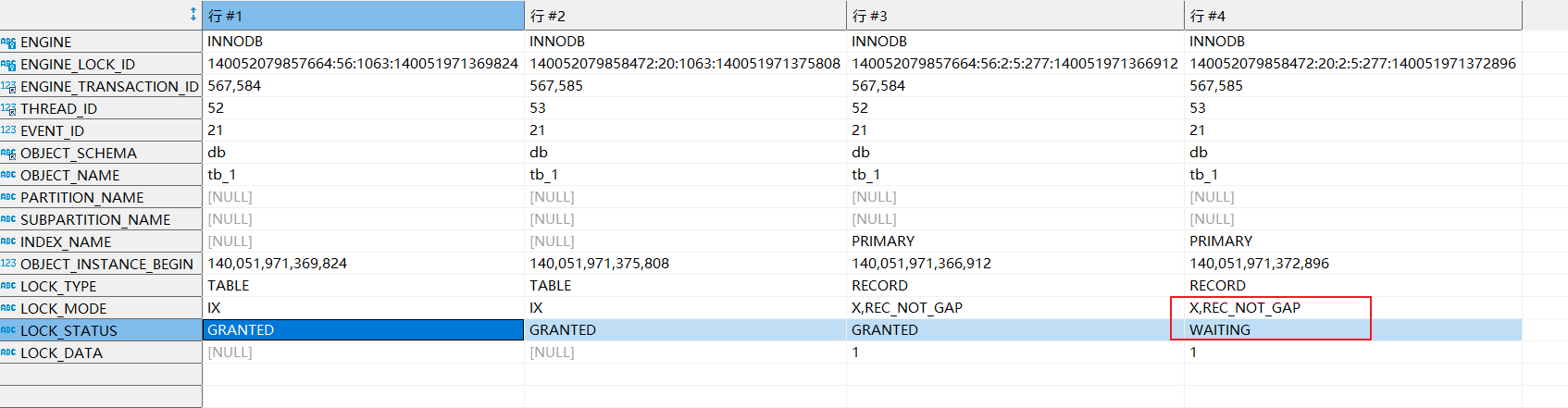 如下图,可以看到567834事务的线程号、事件id以及这个事务在tb_1表上了一把IX意向读锁: