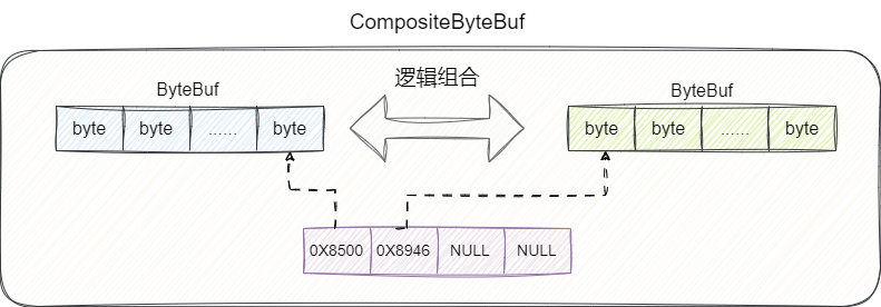 而Netty则不是这样做,它的设计思路是直接将两个数组,逻辑上组合,即通过一个数组指向这两个引用,从逻辑上视为一个整体,而不是物理操作上的组合:
