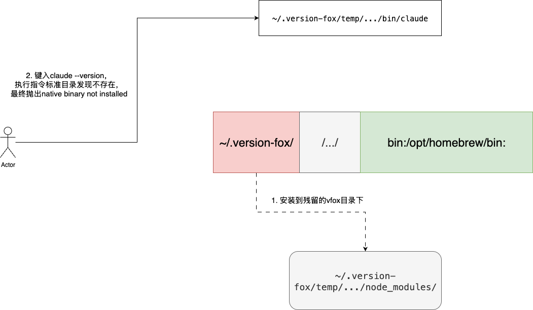 当我们执行 npm install -g claude-code 时,按照预期应该通过 Homebrew 的 node 包管理器完成安装。但由于 vfox 卸载不干净,PATH 仍被其劫持,导致这条指令最终走到了残留的 vfox 执行,安装到了 vfox 的目录。