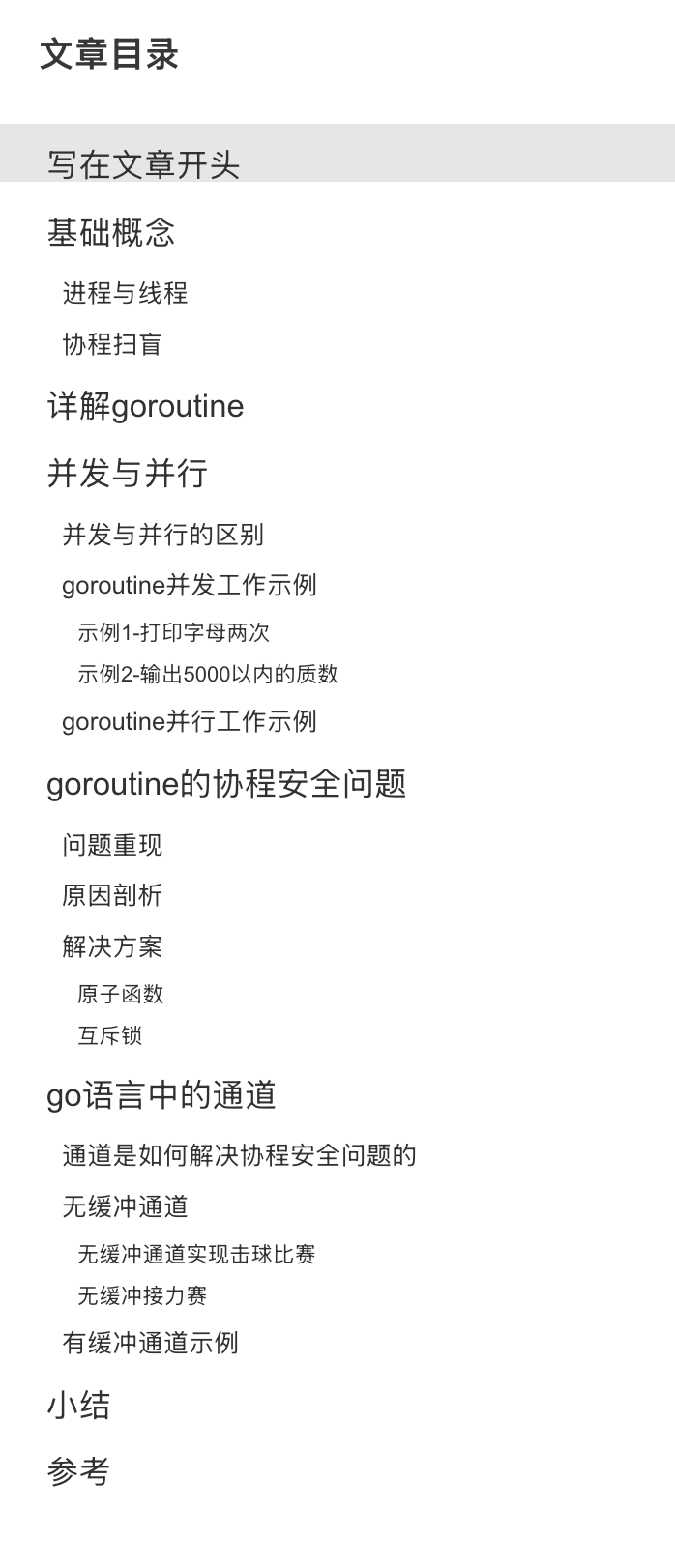 以笔者 Go 协程文章为例,整体的纲要与学习路径类似: