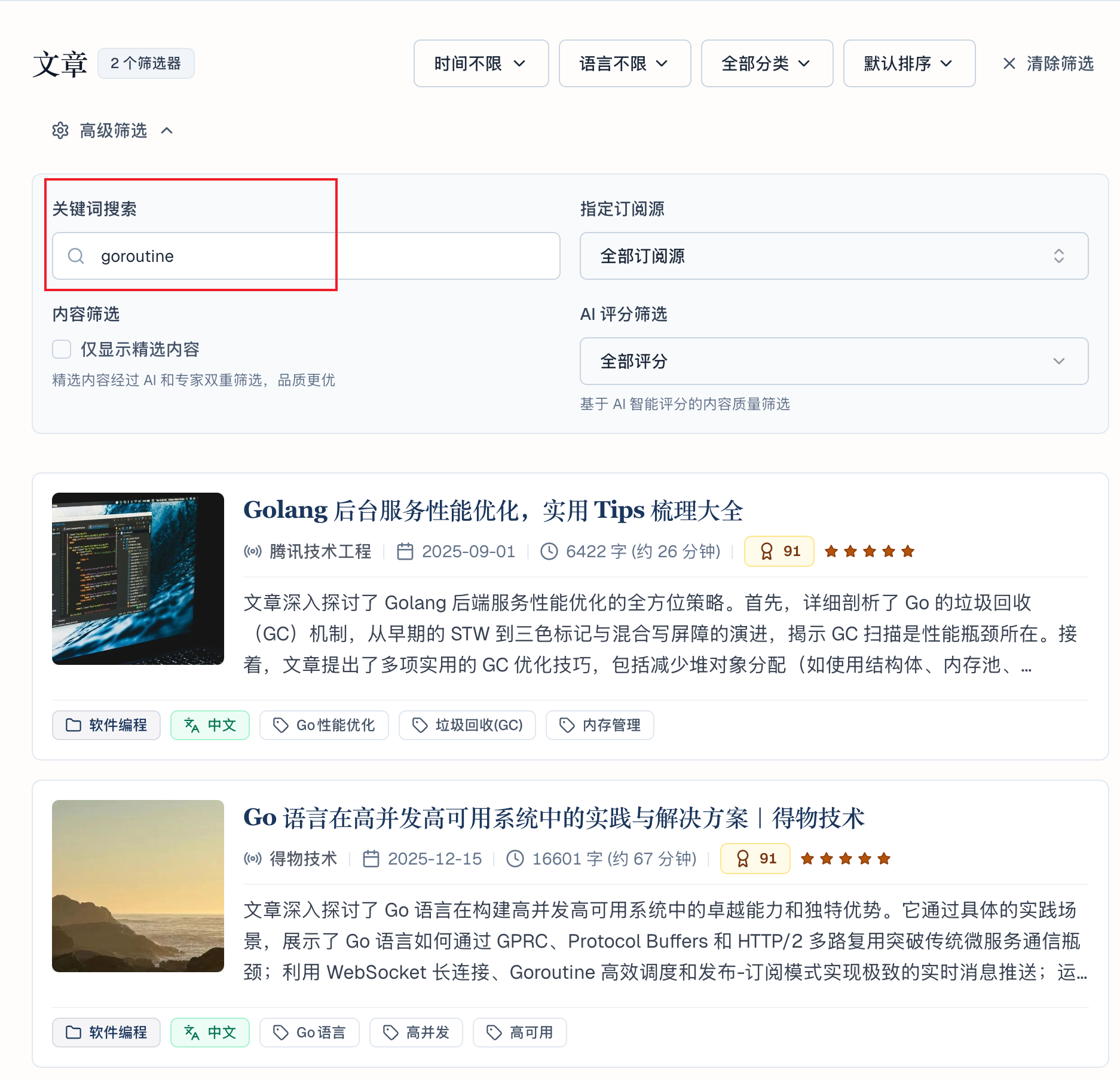2. 公众号搜索:微信搜索能触达大量公众号独家技术内容,且通过阅读量、点赞等社交数据天然筛选出高质量文章。