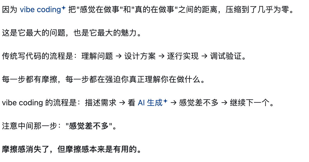 为什么我会感觉vibe coding让程序员越来越浮躁了?:https://www.zhihu.com/question/1951716962645288920/answer/2015813714209701999 (opens new window)
