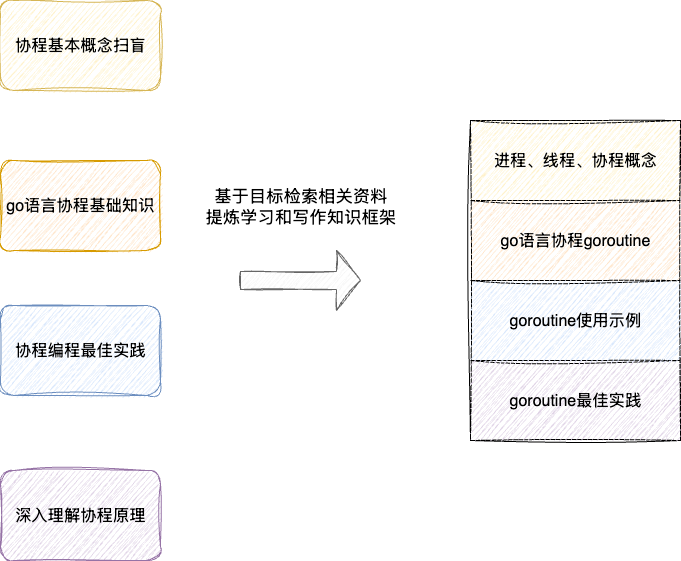 以笔者23年写的这篇《写给Java开发的Go语言协程实践》为例:https://mp.weixin.qq.com/s/JBTxdiHz4wW_6zoGuEH5_A (opens new window)。作为Java程序员对舒适区之外技术的探索,确定目标时,笔者检索资料套路为: