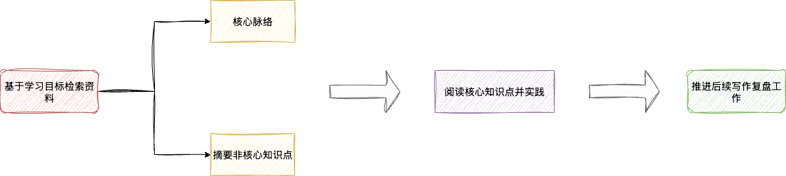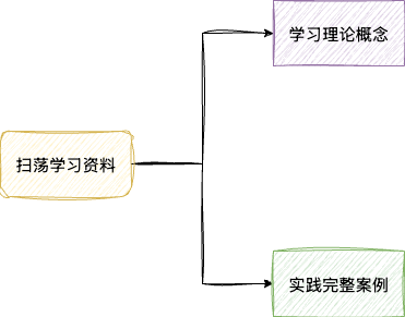 完成知识材料收集和学习目标制定之后,就可以着手学习了。以笔者为例,目标制定阶段已收集所有高质量的资料,这一阶段笔者会扫荡式学习与实践,即阅读资料中每个核心概念,对于不理解的知识点会通过扩充资料来理解掌握,确保知识泛化。