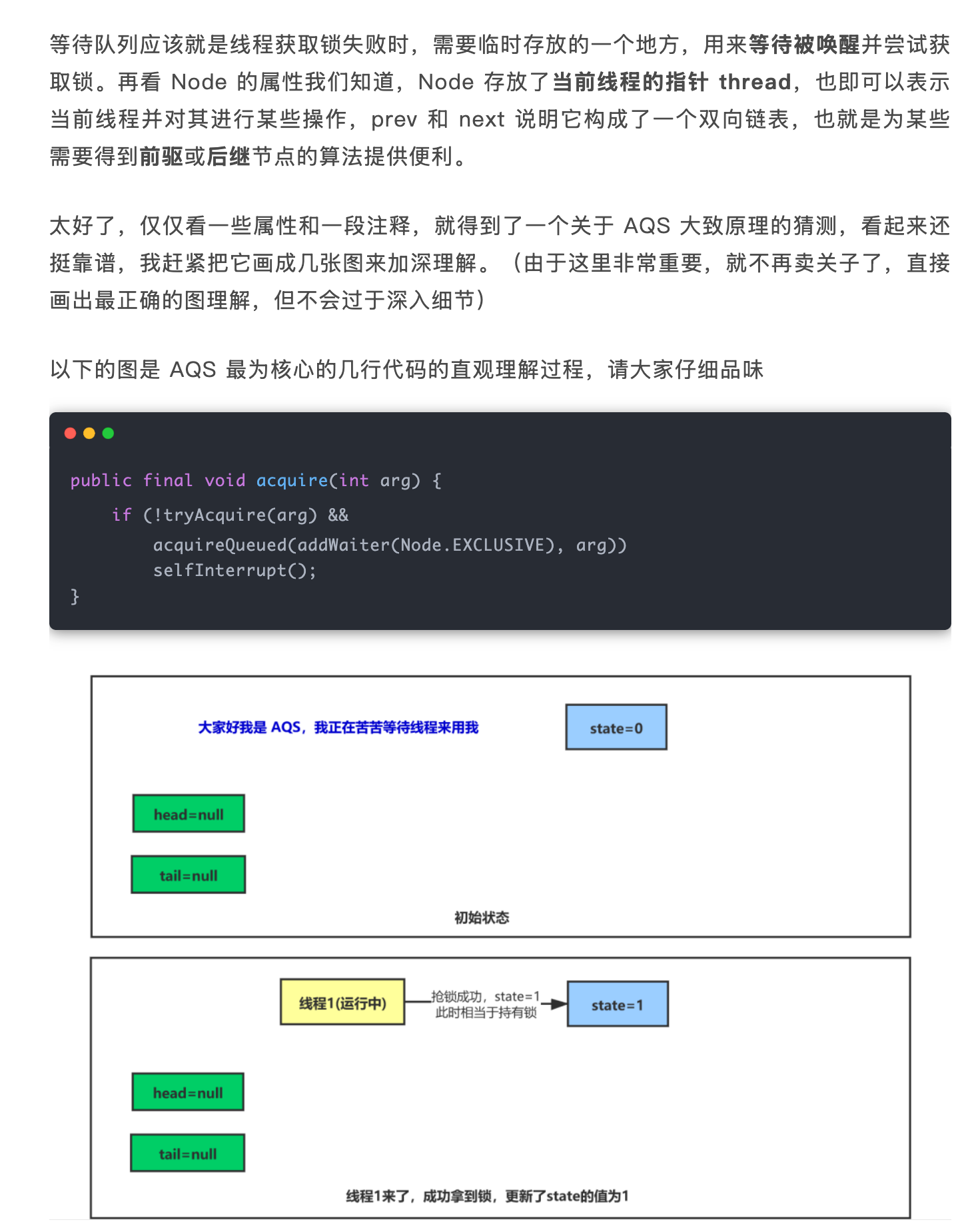 如果在表述过程中突然出现很突兀的概念,对读者来说是非常灾难的,以这篇 AQS 源码讲解为例: