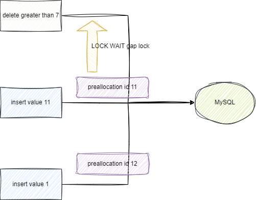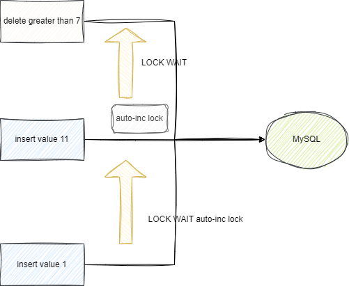 如下图所示,第一条插入语句拿到11后等待gap锁释放,而插入语句2依然可以直接拿到自增id的值12: