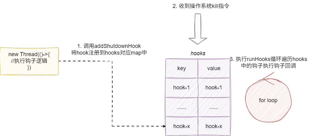 而虚拟机钩子注册的原理本质上就是在调用addShutdownHook时,其底层将这个现场hook注册到一个hooks的map容器中,并在shutdown的时候遍历调用这些hook线程: