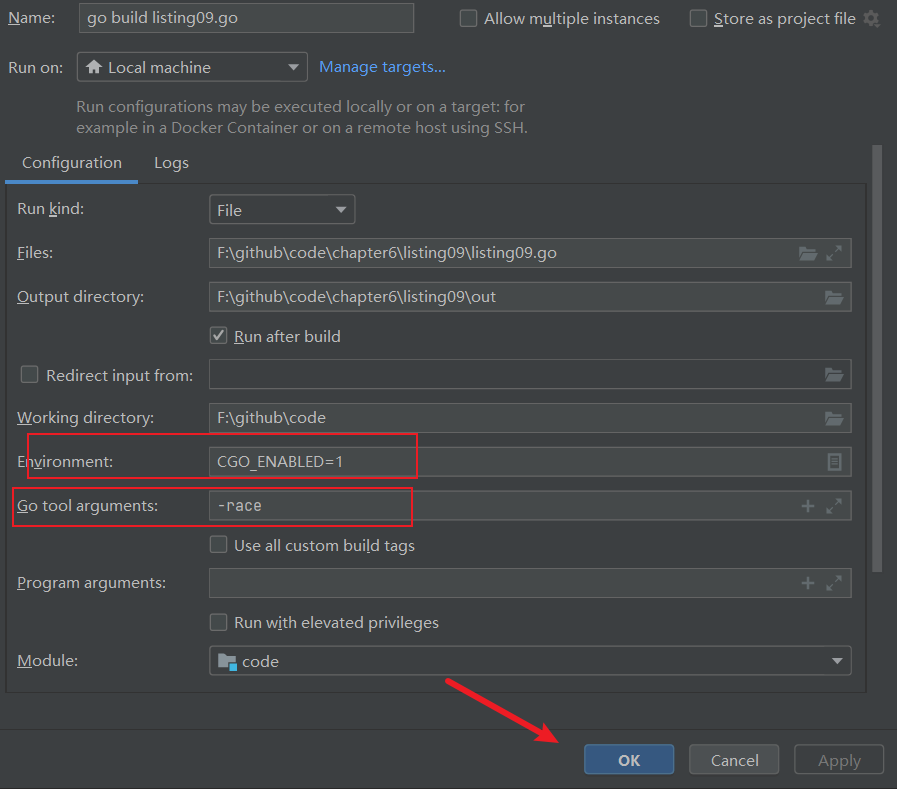 由于上文我们已经完成所有编译环境的配置,使用GoLand在edit configurations下即可完成上述命令行的配置: