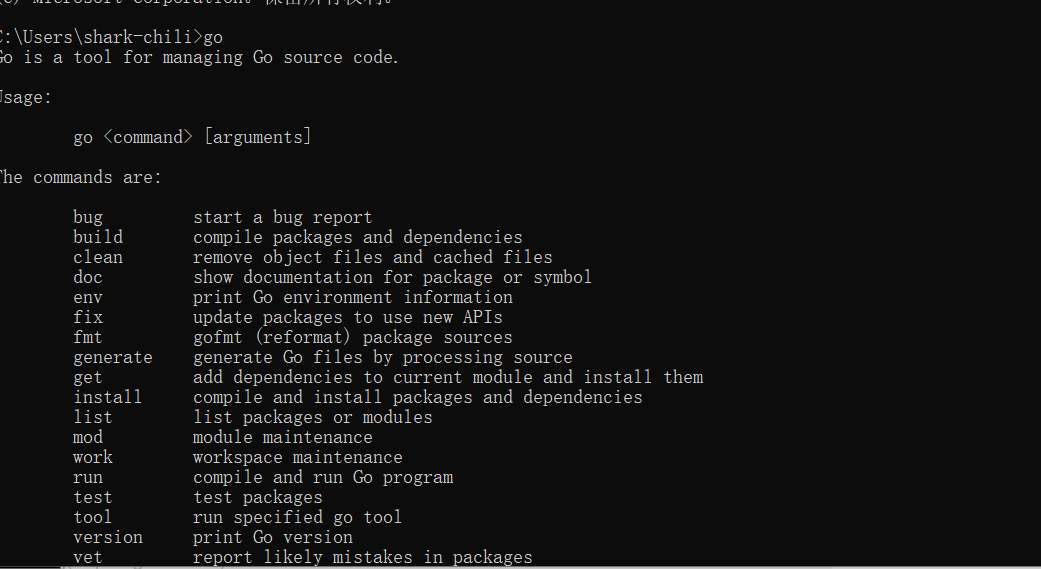 安装go编译器后,它会自动帮我配置环境变量,所以完成安装后我们直接在cmd输入一下go,如果可以看到下图中的提示即可说明安装成功: