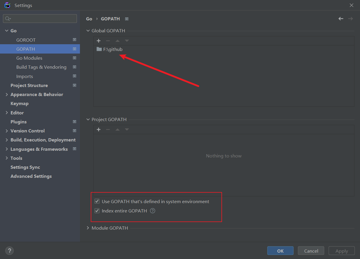 GoPath配置为你后续存放项目的路径,并勾选下面两个选项。