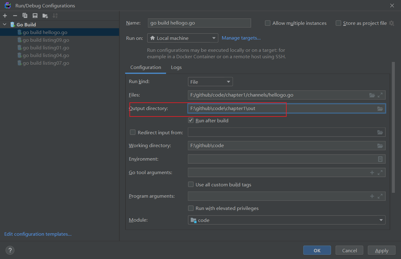 选择输出目录,当前go文件编译后的文件就会在这个out目录下。